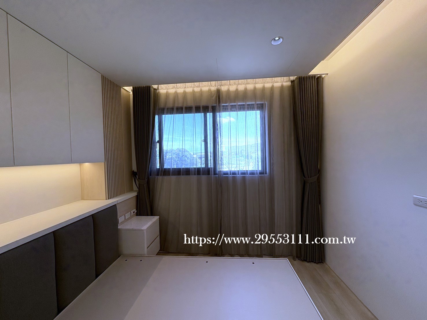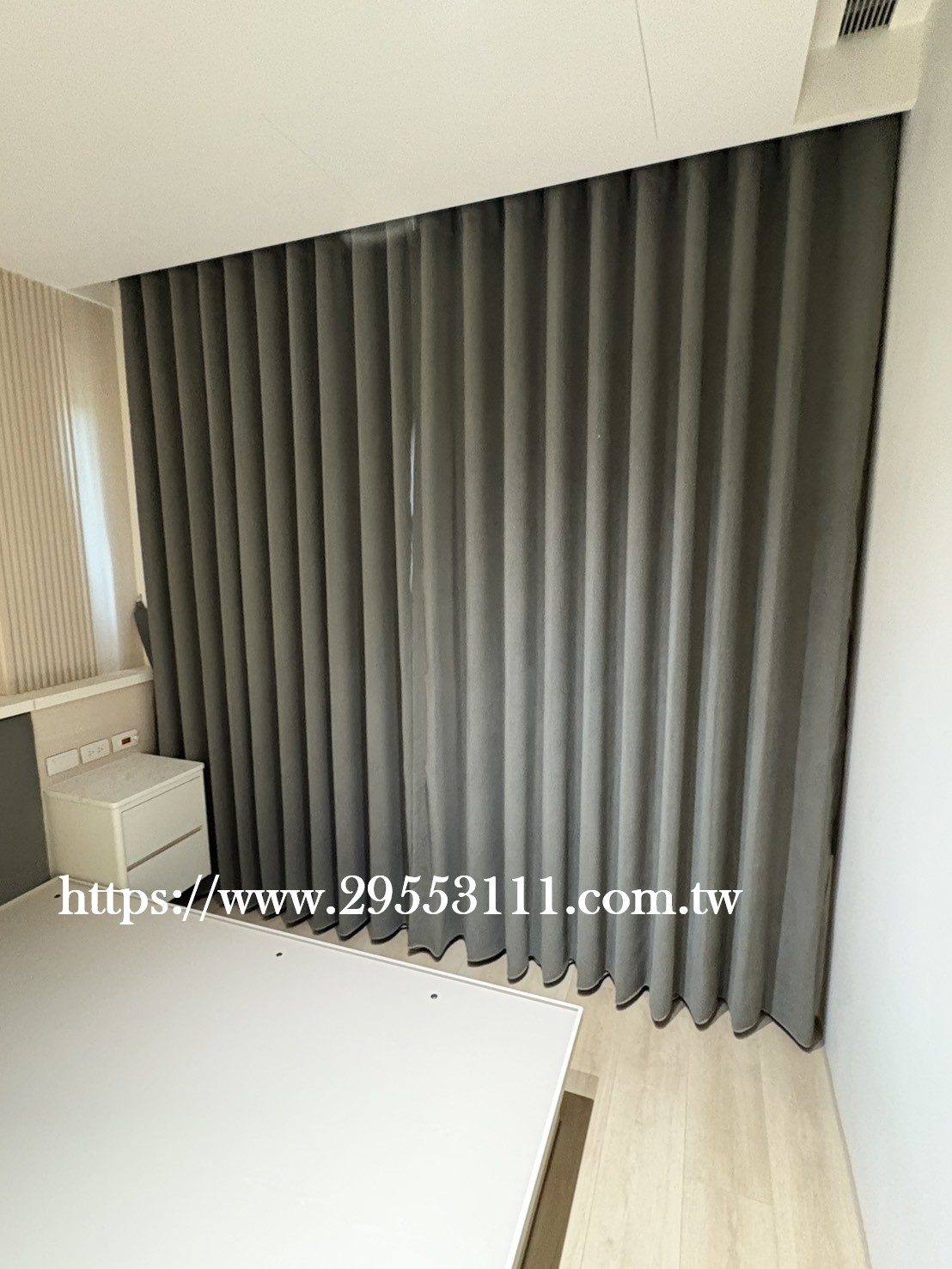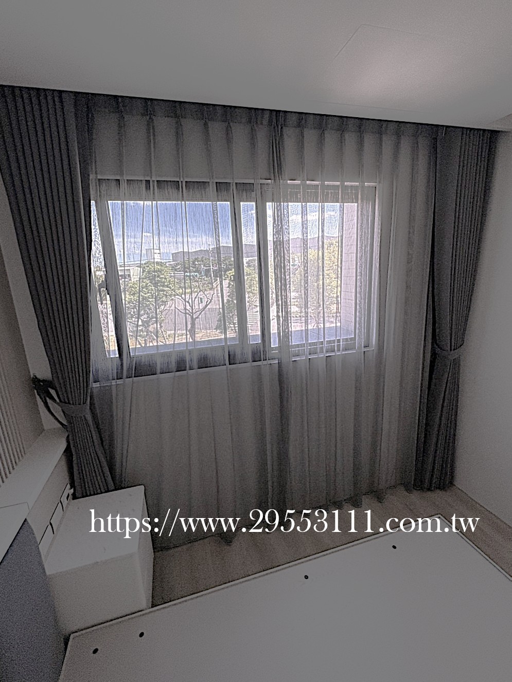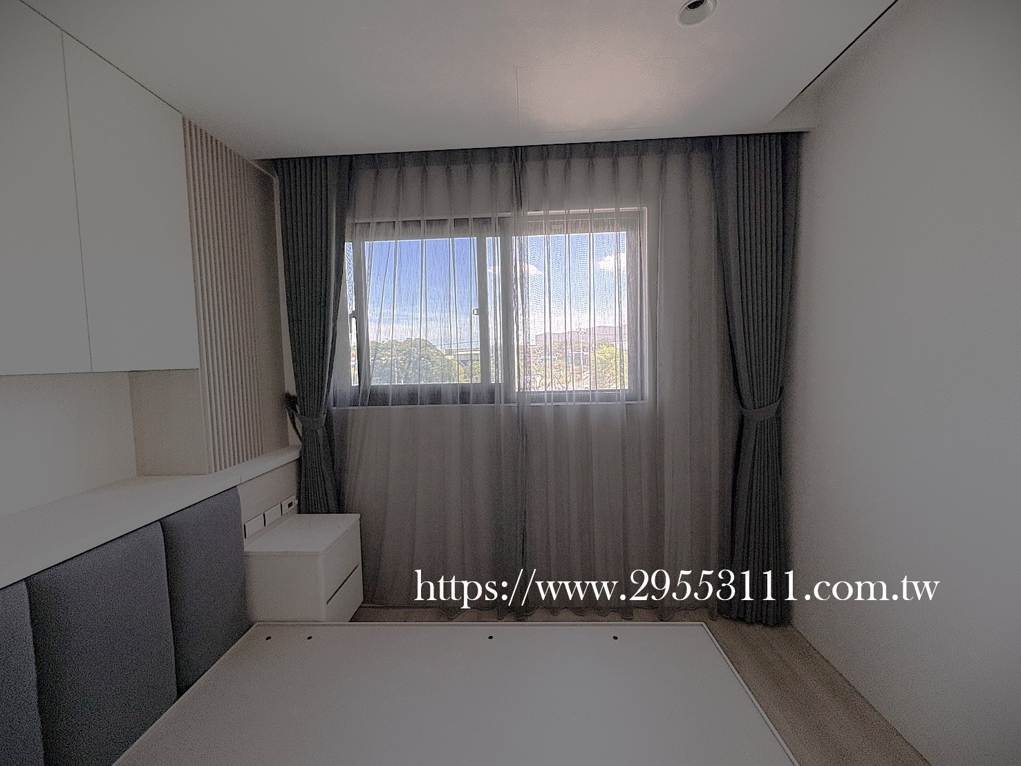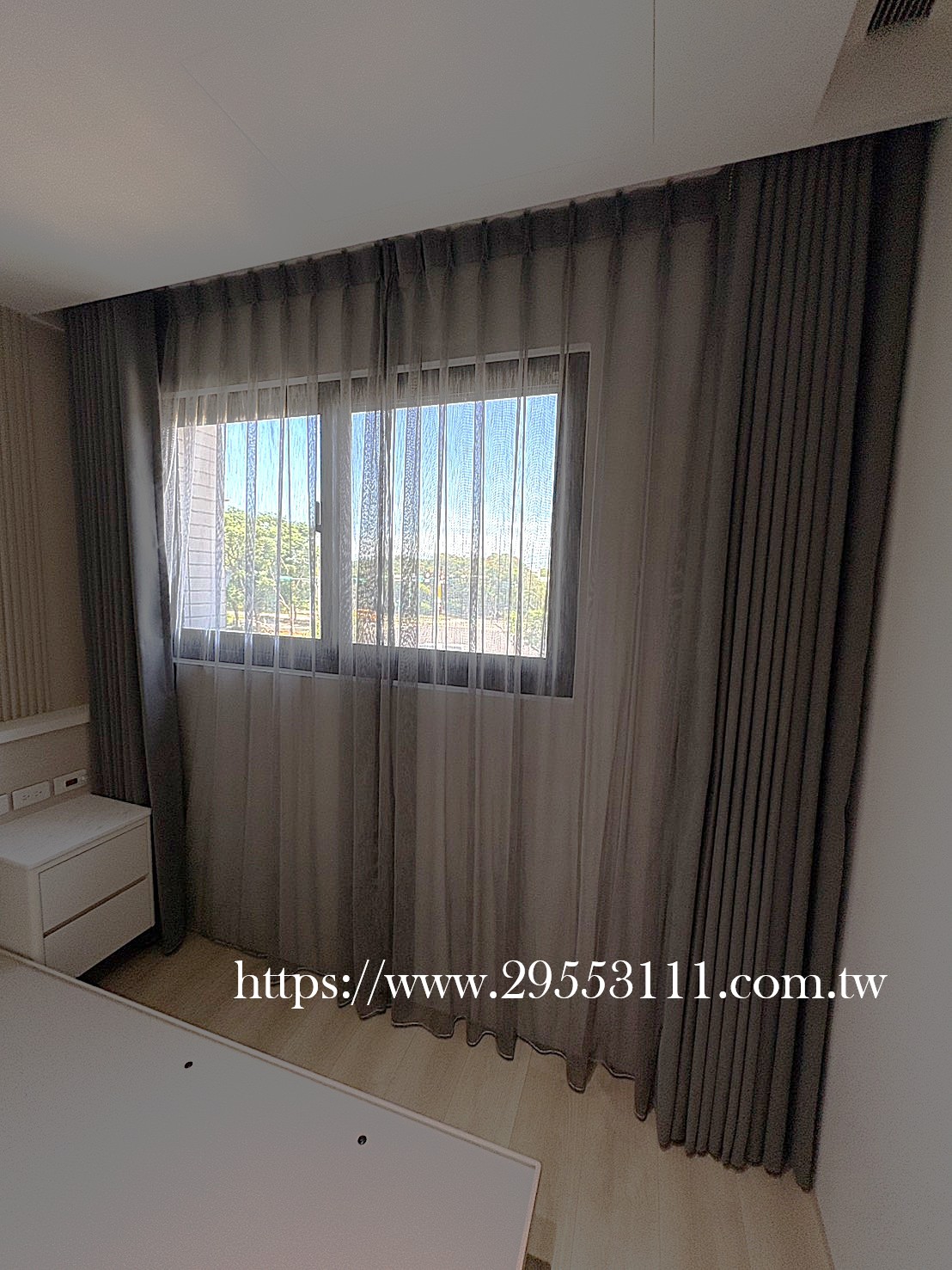 主臥以落地窗做滿牆的型式選用深灰色遮光窗簾布搭配灰色調窗紗裝潢安裝施工