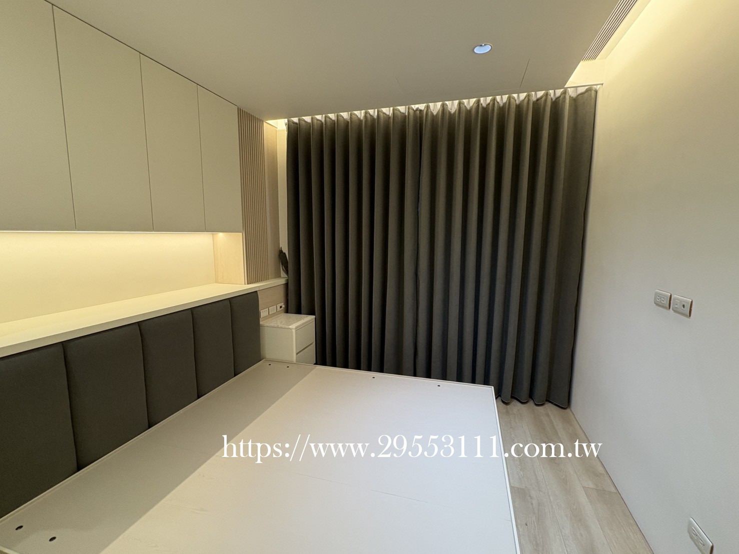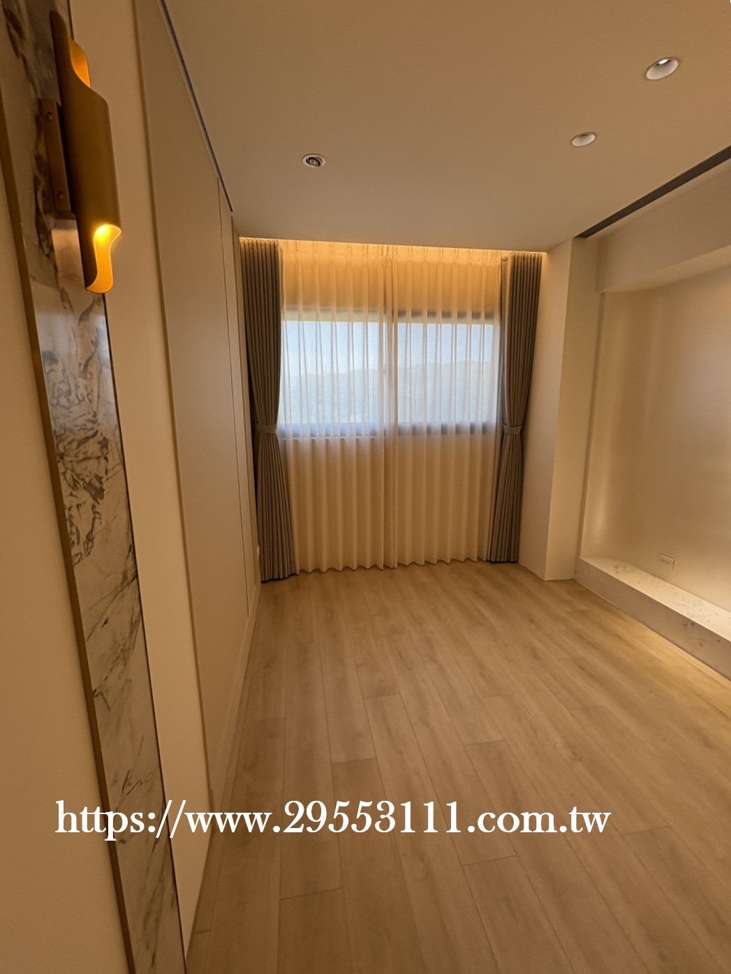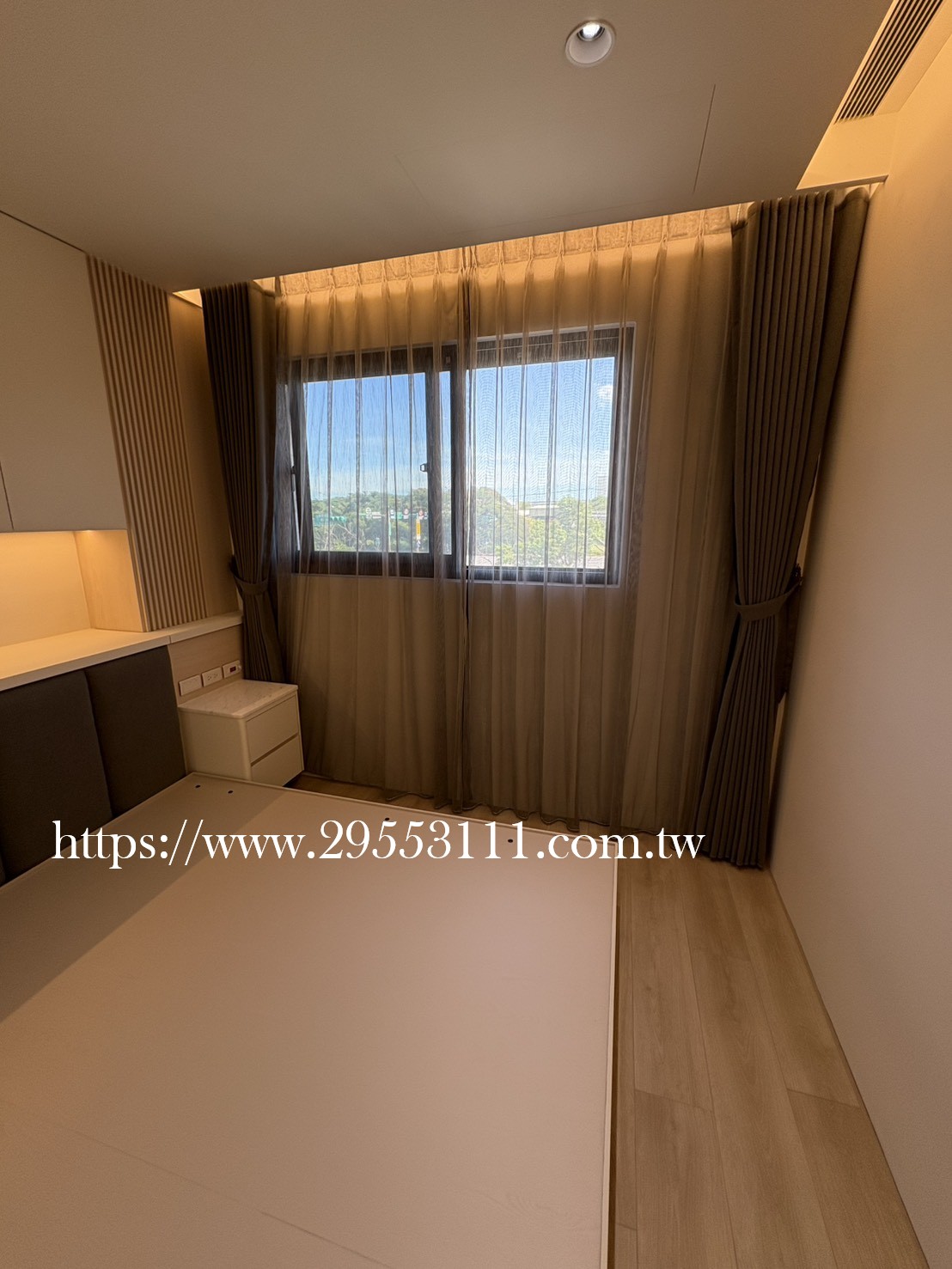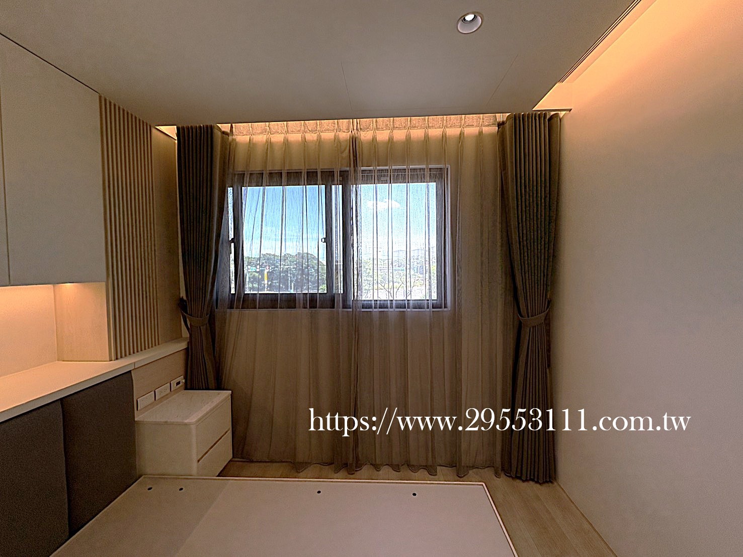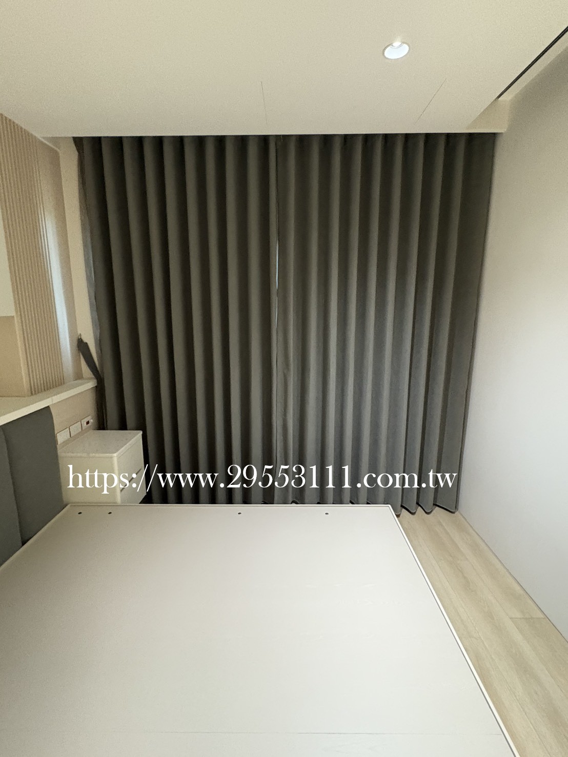 主臥以落地窗做滿牆的型式選用深灰色遮光窗簾布搭配灰色調窗紗裝潢安裝施工