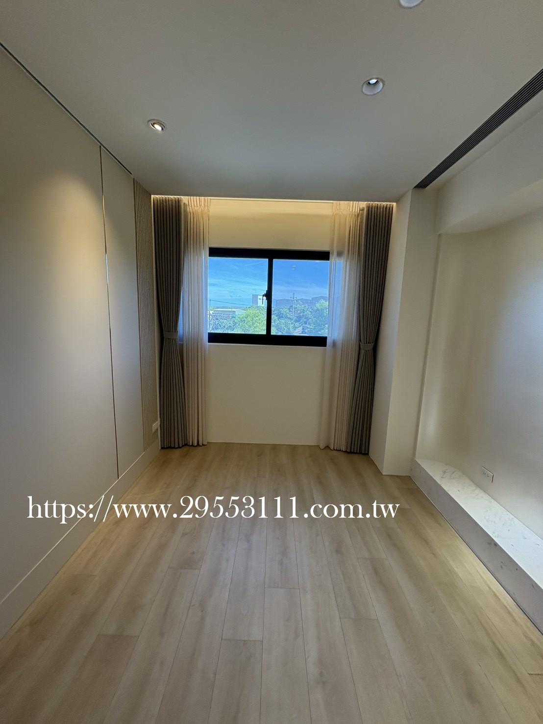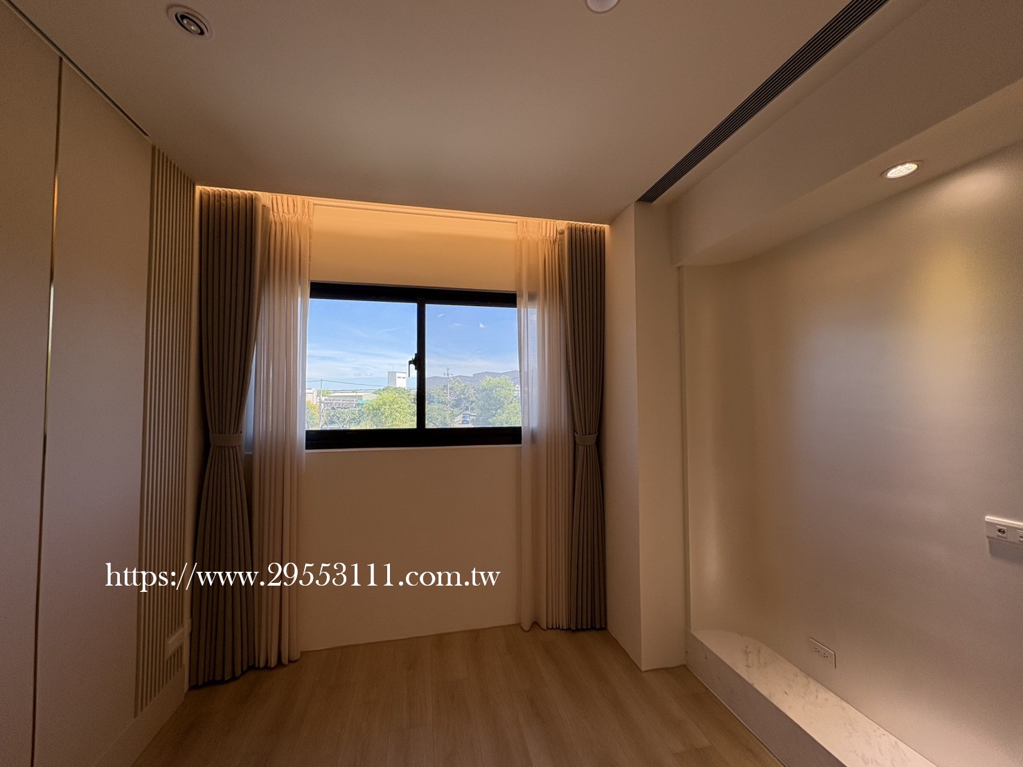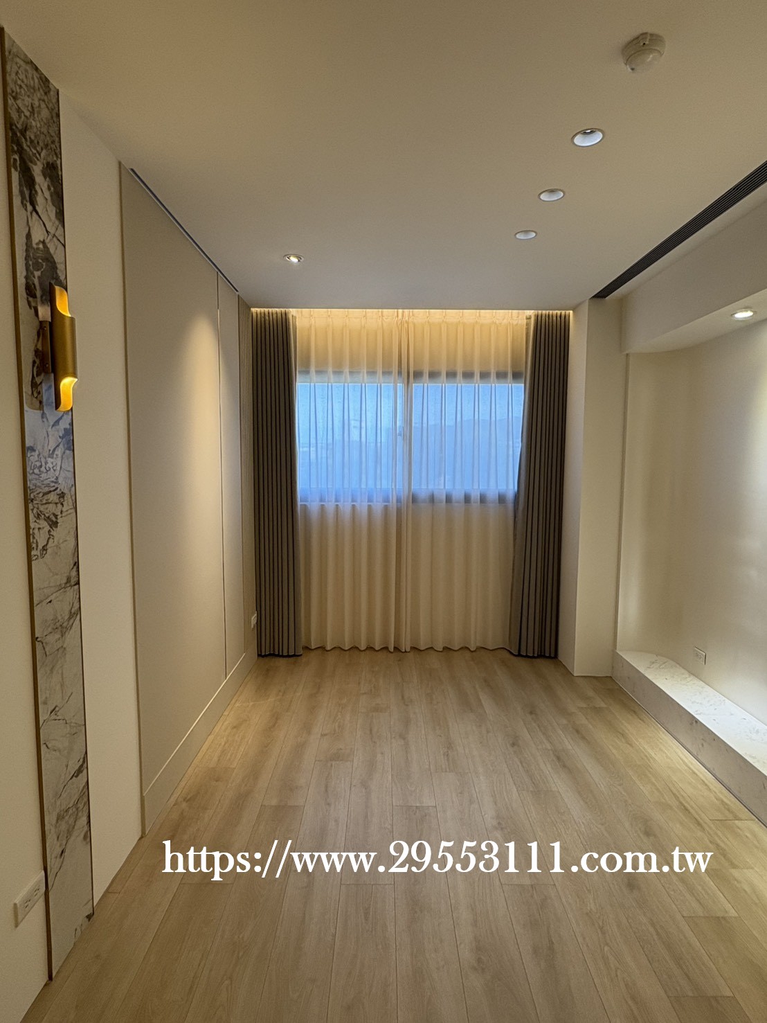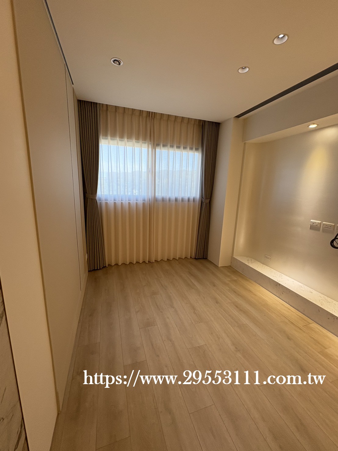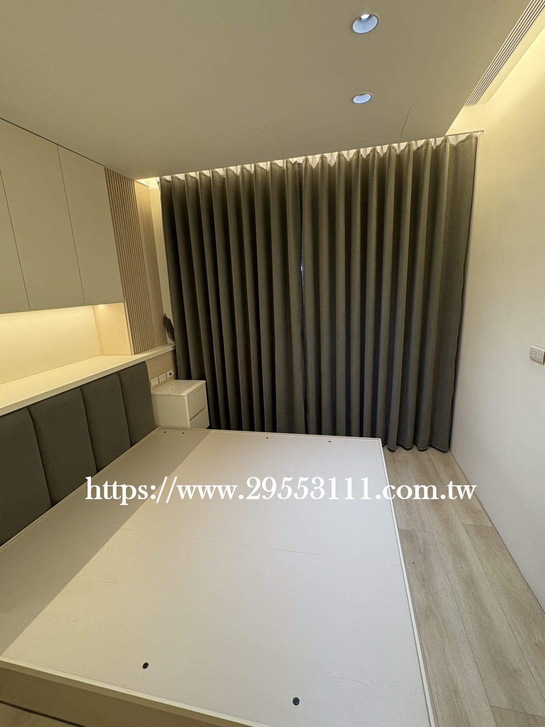 主臥以落地窗做滿牆的型式選用深灰色遮光窗簾布搭配灰色調窗紗裝潢安裝施工